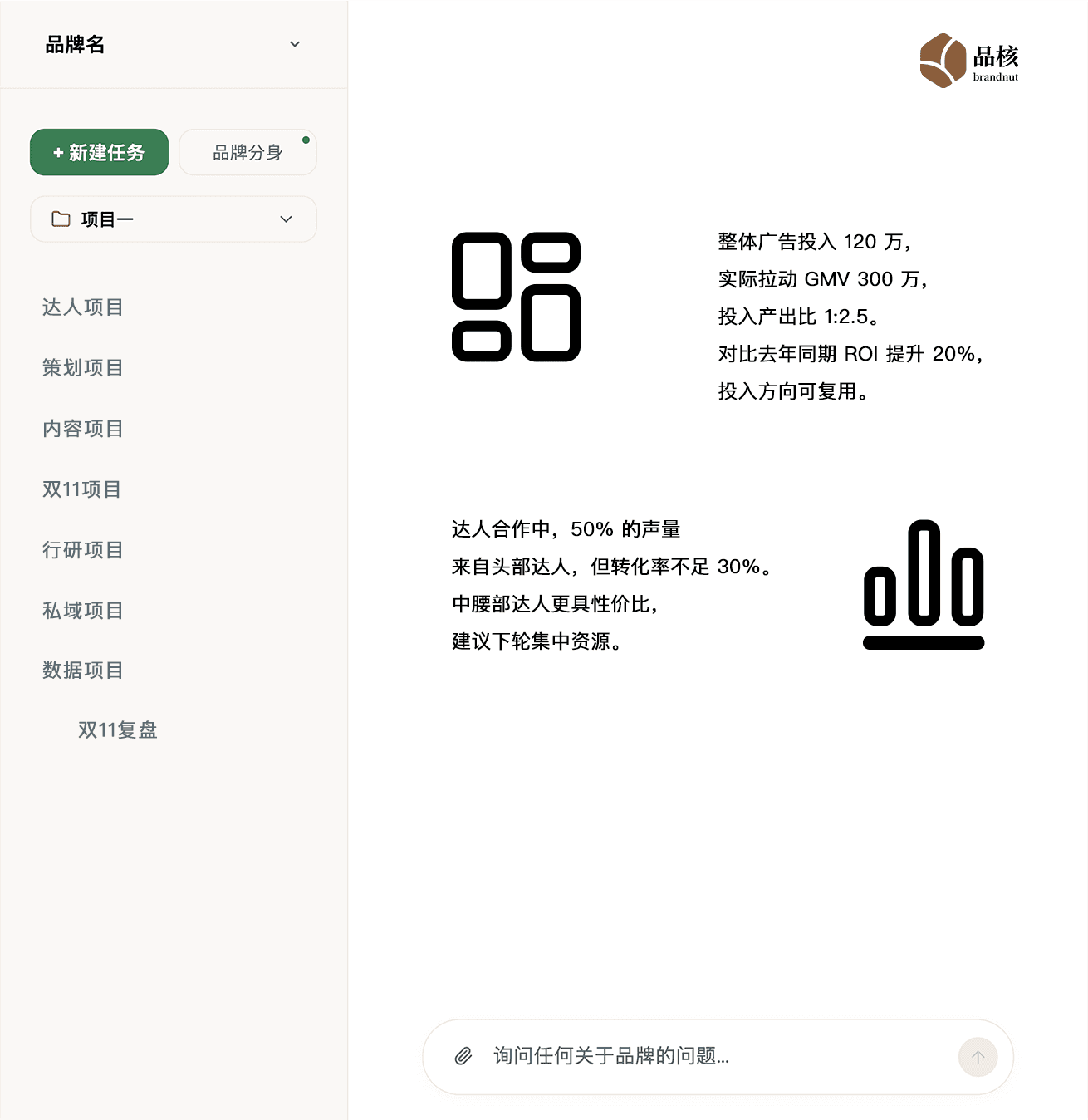 “内容太多没人管用,产出和策略脱节。现在品核能帮我们筛选出有效内容,并直接生成执行参考。”